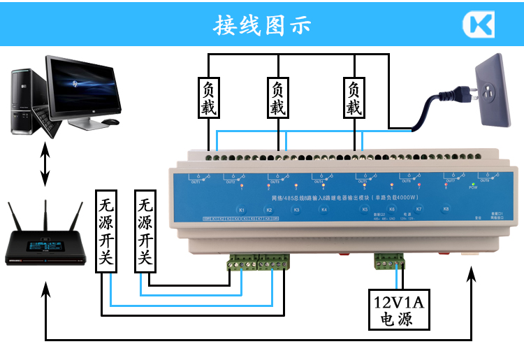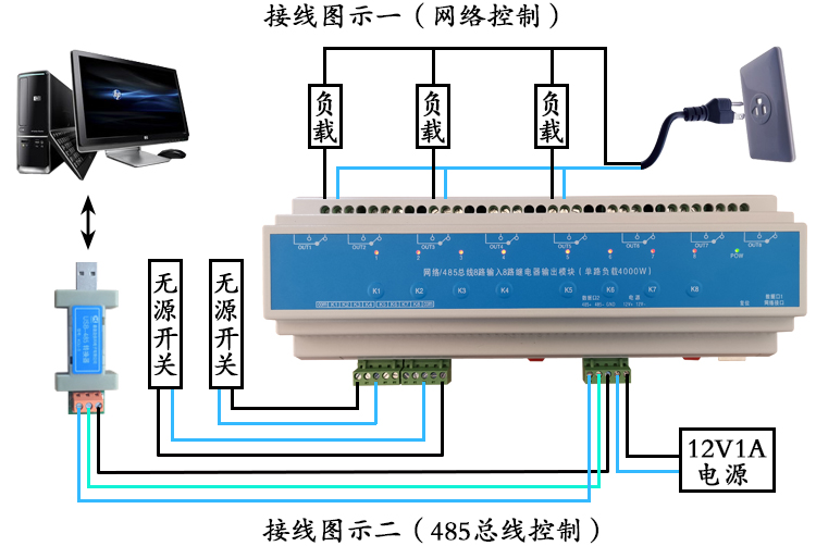 RJ45網絡/RS232/RS485總線4/6/8路輸入輸出30A繼電器智能照明模塊